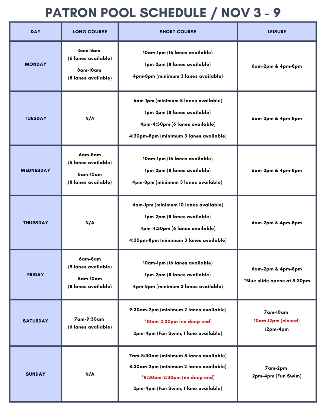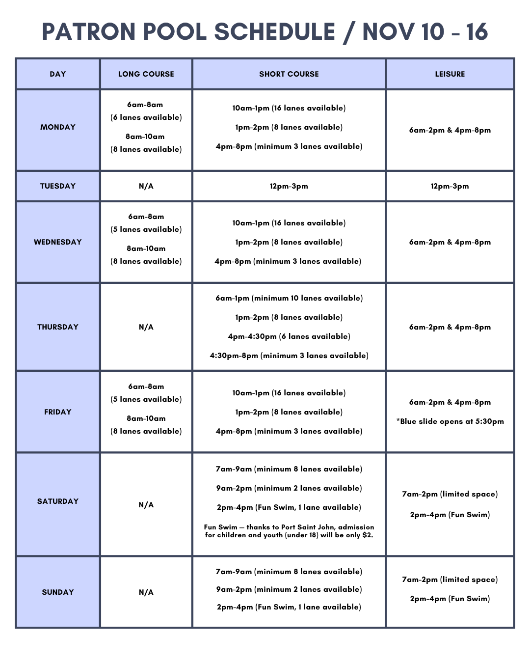 The Canada Games Aquatic Centre has the only 50-metre pool in New Brunswick with its timing system capable of scoring swimming, diving, water polo and artistic swimming. The depth of the pool is 3.5 feet (shallow end) to 14 feet (deep end). The competition pool also has two one-meter springboards, two three-meter springboards, and one five-meter diving platform.